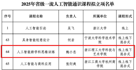 近日,浙江省教育厅发布《关于2025年省级一流人工智能通识课程及省级一流人工智能通识国际化课程拟立项名单的公示》。我院申报的《人工智能跨学科思维训练》课程,成功入选省级一流人工智能通识课程拟立项名单。