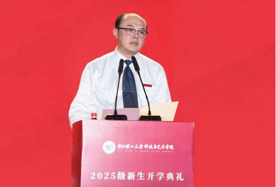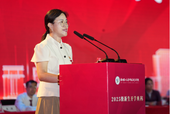 院长胡琦讲话。他代表学院向全体新生致以最热烈的欢迎,并为全体新生讲授开学第一课暨文化素质教育第一课。他指出,任何一个文明的赓续传承、任何一个国家的繁荣发展,都离不开深厚的文化底蕴与精神力量。大学是文化传承与创新的重要载体,其本质在于以坚定的文化自信和高度的文化自觉培养有正确文化立场、宽广文化格局、积极文化思维、远大文化使命的时代新人,不仅在知识层面传道授业,更于精神层面涵养人格、塑造价值,在赓续传统与开创未来之间构筑桥梁。大学的根本使命在于文以化人、学以铸魂,它关乎精神的塑造、价值的引领、素质的健全、能力的提升,关乎我们如何认识世界、定位自我、开创未来。他从弘扬和传承中华优秀传统文化、革命文化、社会主义先进文化三个方面,勉励青年学子要从优秀文化中汲取精神力量,将文化自信的基因融入血脉,并向同学们提出四点希望:一是坚持正己修身,做崇德向善、胸怀开阔的新时代青年。希望同学们始终将“崇德修身”摆在为人处世的首要位置,在每一次自省中进步,在每一次自律中成长,将真善美的追求转化为自觉的行动,在人生道路上行稳致远。二是牢记历史责任,做矢志报国、勇担使命的新时代青年。希望同学们自觉把“小我”的成长融入“大我”的格局之中,将青春理想锚定国家需求,让大学时光真正成为人生的“增值期”、不负时代的“奋斗期”,真正把“报国志”化作“实干行”,用过硬的学识本领扛起时代赋予的使命。三是践行知行合一,做守正创新、敢为人先的新时代青年。希望同学们既要仰望星空,也要脚踏实地,拥抱瞬息变化,勇立时代潮头,让创新成为专业学习的引擎,让创业成为人生远航的动力,在实现中国梦的生动实践中放飞青春梦想。四是融通文理之道,做智慧通达、本领过硬的新时代青年。希望同学们承历史之脉、融文理之长,既拥有“科技”的理性思维与创新能力,亦葆有“艺术”的人文关怀与价值判断,成长为具有鲜明“科艺”辨识度的时代新人。