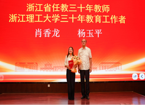 胡琦为省任教三十年教师和校三十年教育工作者代表颁发证书并献上鲜花。
