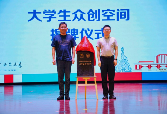 区人力资源和社会保障局党委委员、副局长徐震厚和科艺学院创业学院副院长应士中为大学生众创空间揭牌。