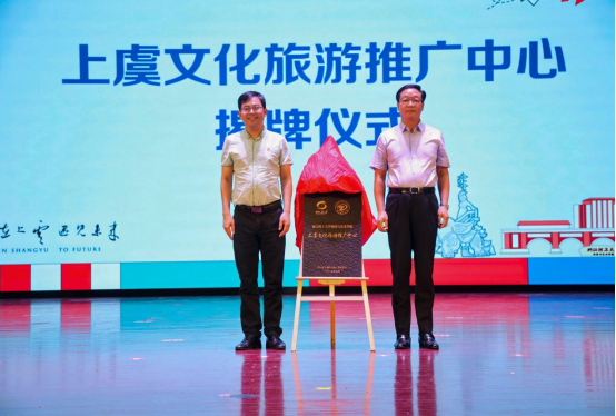 方水明和王银苗为上虞文化旅游推广中心揭牌。