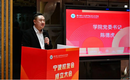 陈德虎代表学院向宁波校友会的成立致以热烈祝贺,向长期以来关心支持母校建设发展的在甬校友致以诚挚问候与衷心感谢。讲话中,陈德虎简要通报了学院近年来的发展成就,并介绍了学院第二次党代会明确的学院发展“1234”总体战略布局。他对校友会提出殷切期望,希望首届理事会能够积极履职,建强组织、凝聚力量、创新形式,将校友会打造成为宁波校友们增进感情、共享资源、合作共赢的坚实平台。同时,他期盼广大在甬校友借助校友会平台,持续深化与母校的联系,关心支持母校事业发展。母校也将始终作为校友坚实后盾,助力校友在宁波这片创新创业热土上取得更大成就,共同为地方经济社会建设贡献智慧与力量。