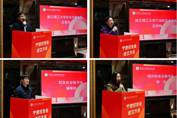 应黎君、吕齐鸣,科艺学院总会秘书长潘林祥、绍兴校友会秘书长姚洁分别代表各方对宁波校友会的成立表示了祝贺,并为校友会未来发展提出了建议性意见。