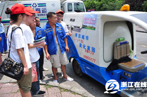 浙江在线杭州7月7日讯(钱津津、叶知舟/摄) 今天,浙江理工大学科技与艺术学院杭州城市生活垃圾分类处理暑期调研小分队的队员们顶着酷暑来到杭州文新环卫所,针对城市主要生活垃圾回收现状,积极地进行调查访问,了解城市生活垃圾处理的过程、方法等,也对此提出了科学合理的建议。小分队还将原创的“垃圾分一分,环境美十分”的宣传图文、袖贴等贴在环卫车和环卫工人的工作服上,以移动宣传的效果。此外,小分队的另一组成员在杭州市天子岭废弃物处理总场进行实地参观考察,加深对杭州城市生活垃圾分类处理现状的了解。