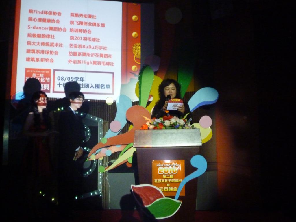 本场晚会设颁奖盛典、元旦汇演两个舞台。由《歌舞青春》为主题的开场舞缓缓拉开晚会的帷幕。院长郑亚莉、院党委副书记谭立章分别宣读了2008/2009学年十佳学生社团、优秀学生社团干部名单。相关部门负责人宣读了第二届社团文化节先进集体、先进个人和精品活动名单。