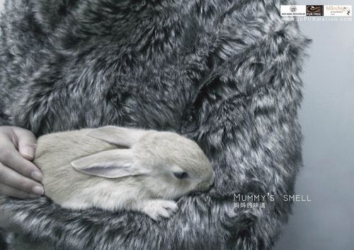 《妈妈的味道》看似简单,但包含了作者渴望小动物不再受到虐待的美好愿望。画面中贵妇温柔地揽着爱宠,乍看下如母亲抱着孩子般温馨,但其实兔子是从贵妇的皮草上嗅到自己母亲的气味,错将她当作自己母亲,才静谧享受地趴在她怀中。作者正是通过这种温馨干净的构图平静地揭示人类的残忍,以此呼吁人们停止这种惨绝人寰的时尚!