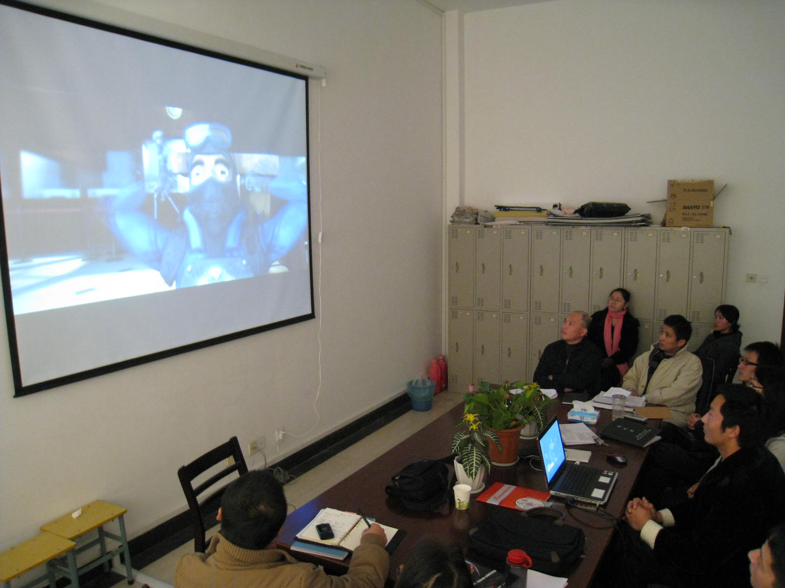 兰岳云就动画短片制作做了汇报。他向老师们展示了自己创作的短片及在上海参与的台湾动画《MUMU》等一系列的商业动画。他指出一部动画短片从前期制作到完成,要经过很多环节,比如一部三维动画短片,要经过分镜头剧本、脚本设定、角色设定、场景设定、建模、灯光、材质、渲染和最后的合成等环节。每一步都重要,每一步都会影响其他环节的制作。动画在艺术的教学中不仅仅是有艺术的基础就能完成一部动画制作的,它是一个由艺术到技术然后回到艺术上来的一个融合过程,这两者缺一不可,所以在教学的基础上要注重学生的平时实践练习过程。