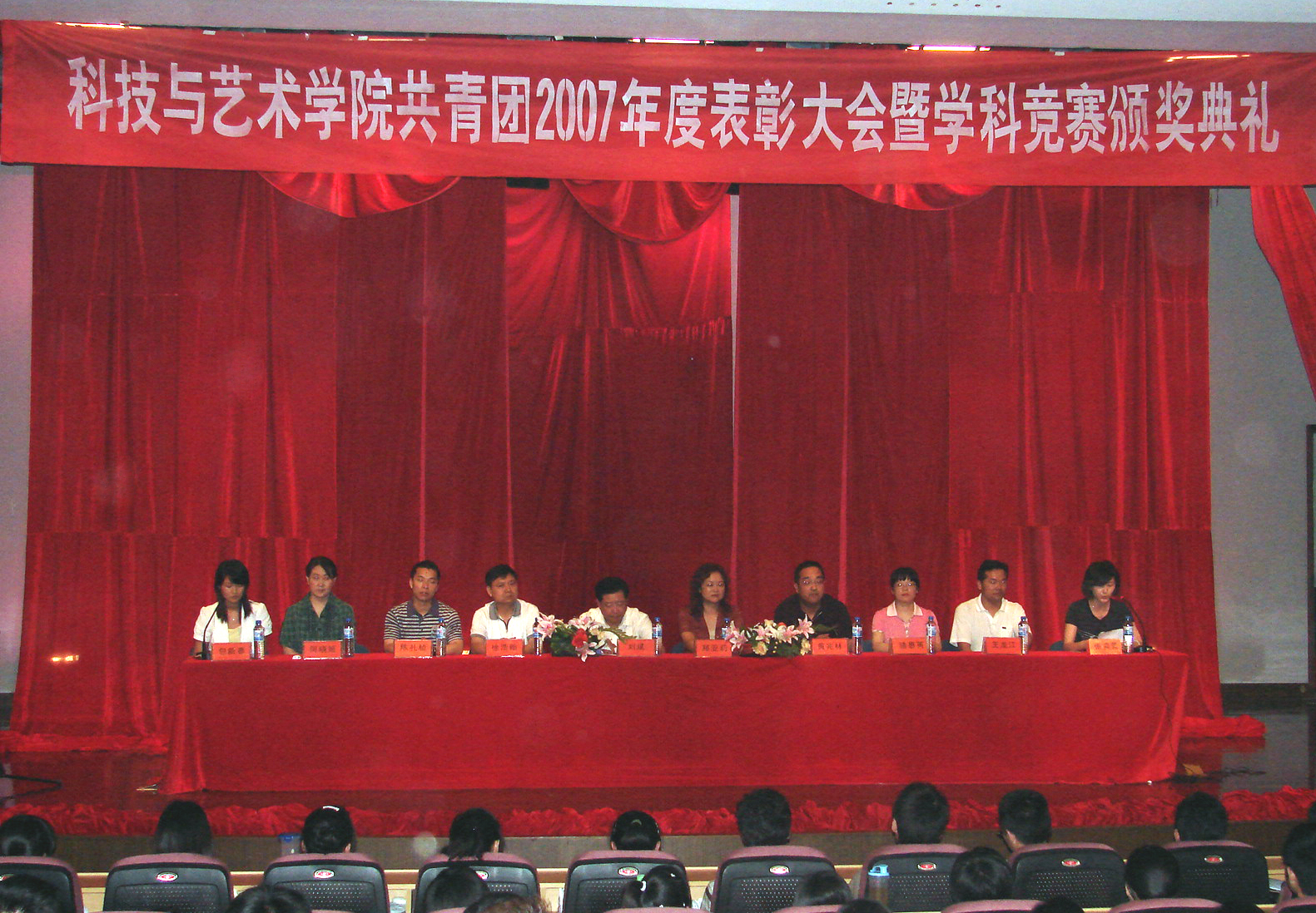 6月11日下午,科艺学院共青团2007年度表彰大会暨学科竞赛颁奖典礼在学院小剧场隆重举行,出席本次大会的领导有院党总支书记兼副院长刘斌,院长郑亚莉,副院长徐浩贻,党总支副书记黄兆林,校团委副书记陈礼桢等。院团委常委张奕蕾老师主持了本次大会。