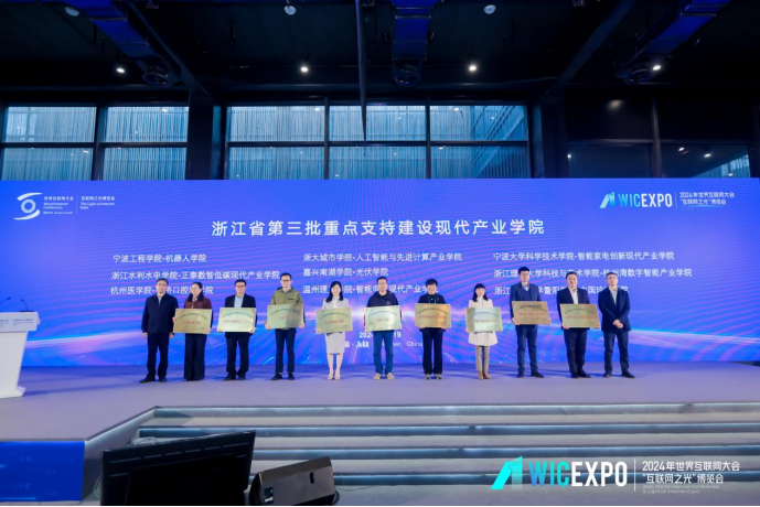 11月19日,浙江省经信厅、浙江省教育厅主办的2024年产教融合推进会在乌镇互联网国际会展中心召开,全省各区市、县经信部门代表、省级现代产业学院代表、产教融合体代表参会。省经信厅副厅长王忠民、省教育厅副厅长陈峰、工信部教育与考试中心副主任刘明亮分别致辞,并为浙江省第三批现代产业学院授牌。我院党委书记陈德虎出席大会并领取了“浙江理工大学科技与艺术学院杭州湾数字智能产业学院”铭牌。