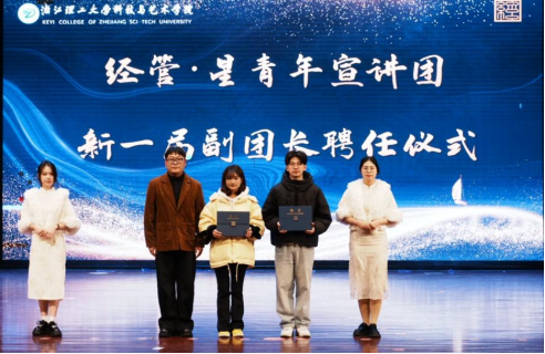 青春宣讲团换届仪式上,经济管理学院(创业学院)星青年宣讲团团长为星青年宣讲团副团长杨洋、徐沛望颁发聘书。