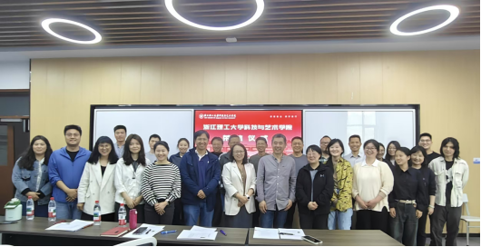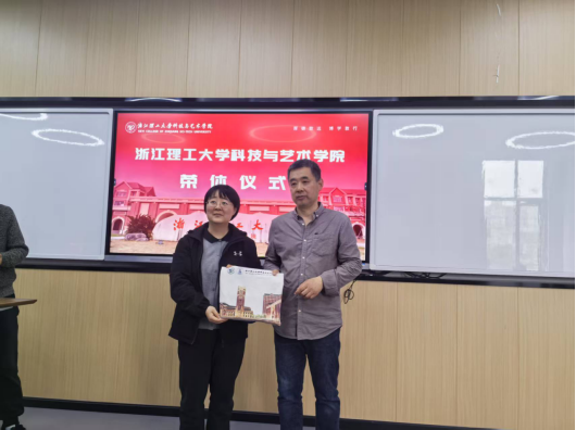 王渊在致辞中细数姚老师与科艺建工学院共同成长的七年点滴。她提到,姚建强老师不仅是专业领域的引路人,更是学院发展的见证者与推动者,“从课程创新到团队建设,姚老师始终以严谨治学的态度和无私奉献的精神,为学院注入了深厚底蕴。”随后,钱津津和楼瑛浩为姚建强老师颁发荣休纪念品,表达对姚老师的感谢与祝福。