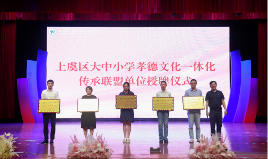 方水明为上虞区杭州湾未来城小学、上虞区小越街道中心小学、上虞区华维文澜小学、上虞区城北实验中学以及学院代表授牌,为大中小学孝德文化一体化传承联盟注入新活力。