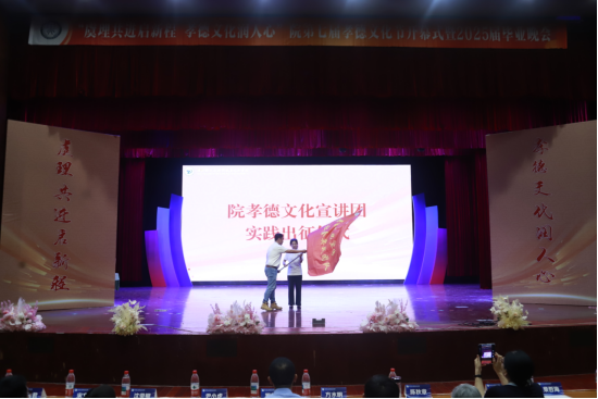 随后,进行院孝德文化宣讲团实践出征仪式。宣传部部长尹小虎为院孝德文化宣讲团代表授旗,开启宣讲团实践出征。在仪式环节后,精心编排的晚会节目聚焦孝德文化精髓,展现毕业生青春华章。学子们通过深情的朗诵、优雅的汉服茶艺表演、荡气回肠的乐器表演、感人至深的歌曲表演等多元形式,让大家在晚会中感受到孝德文化的魅力与浸润人心的力量。