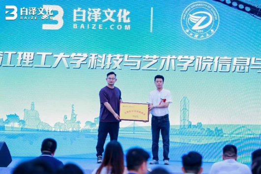 仪式现场,学院与白泽文化正式签订产教融合共同体合作协议,并进行“大学生实习实践基地”“产教融合共同体”授牌。作为信控学院推进教育科技人才一体化的重要举措,此次合作将聚焦AI数字技术研发、产业人才培养、学生实习实践三大核心方向。白泽文化将开放企业真实项目场景与技术平台,为学院学生搭建课堂——产业无缝衔接的通道,助力产业学院发展,提升学生行业实操能力与职业素养。