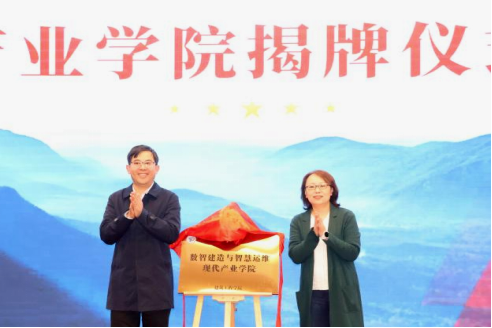 在揭牌与授牌环节,方水明与王渊共同为“数智建造与智慧运维产业学院”揭牌。