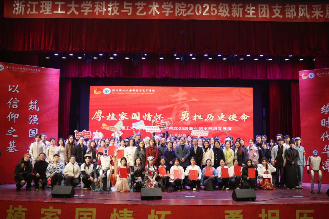 岁月峥嵘映初心,青春奋进正当时。今年是中国人民抗日战争暨世界反法西斯战争胜利80周年,亦是中华人民共和国成立76周年。我们站在“十四五”收官、“十五五”启幕的交汇点,为引导新生团员厚植家国情怀、勇担时代使命,11月28日晚,浙江理工大学科技与艺术学院2025级新生团支部风采展演在小剧场顺利举行。本次展演邀请院党委副书记方水明、组织部部长罗超群、宣传部部长钱津津、学工部副部长汪一伦、团委书记胡长安担任评委,各二级学院党总支副书记、团委书记、辅导员参与活动。