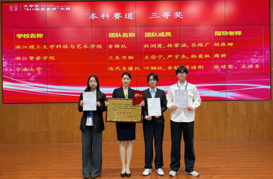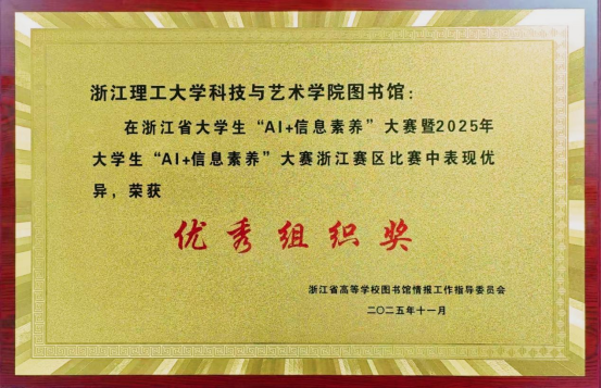 本次大赛吸引全省76所高校的15817名学子踊跃参赛。我院杜浏霞、林紫涵、吕路广三位同学组成的“青锋队”,在胡燕娜老师的悉心指导下,作为全省唯一一支独立学院参赛队成功晋级本科组决赛,最终斩获省本科组三等奖;胡燕娜老师获评优秀指导教师奖;浙江理工大学科技与艺术学院图书馆荣获优秀组织奖,三项荣誉为学院再添光彩。