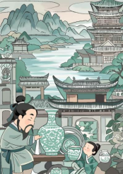 作品介绍:作品紧扣“墨韵绍兴书艺传承”主题,聚焦绍兴上虞青瓷与书法艺术的融合。以现代插画形式,将王羲之书法的飘逸线条、徐渭笔墨的狂放气势,巧妙融入上虞青瓷的造型与纹饰之中。画面里,青瓷匠人精心雕琢器物,周围环绕着以书法线条演化而成的青瓷花纹,背景则是绍兴典型的水乡风光与古朴建筑。借助这种解构与重组,让书法艺术的韵律在青瓷载体上焕发生机,既展现上虞青瓷的精湛工艺,又传递绍兴书法文化的深厚底蕴,可助力城市文创开发与文化传播,推动其创新发展。