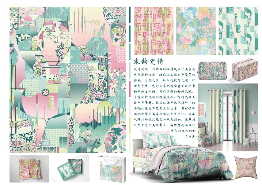 作品介绍:该作品融合传统宋代美学与现代设计理念,汲取上虞越窑青瓷简约、雅致、自然之美,融入现代的几何、肌理等手法。色彩上采用越窑青瓷经典青釉色为主色调,辅以淡雅的粉彩点缀,营造清新脱俗的视觉效果。材料选择上,运用可降解、低碳环保的绿色材料,结合现代绿色工艺与数字技术,重新演绎传统纹样的美学价值与文化内涵。这不仅是对传统文化的传承与创新,更是对自然生态之美的彰显,实现了传统与现代、文化与生态的和谐共生。