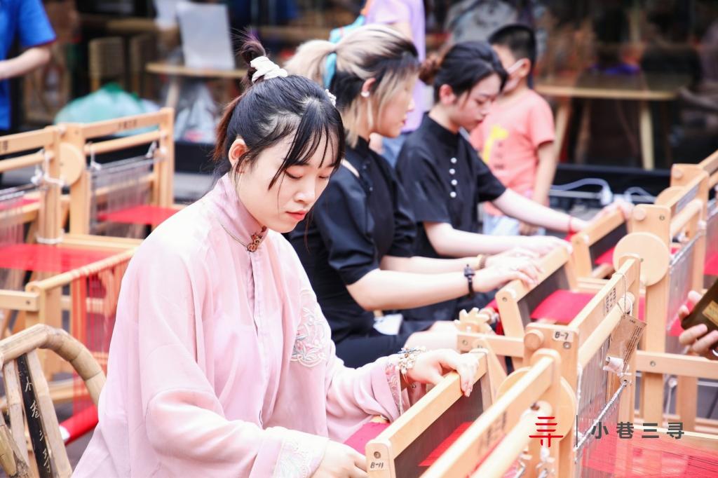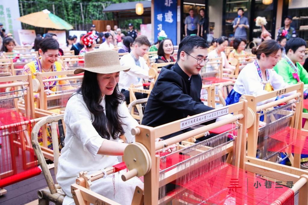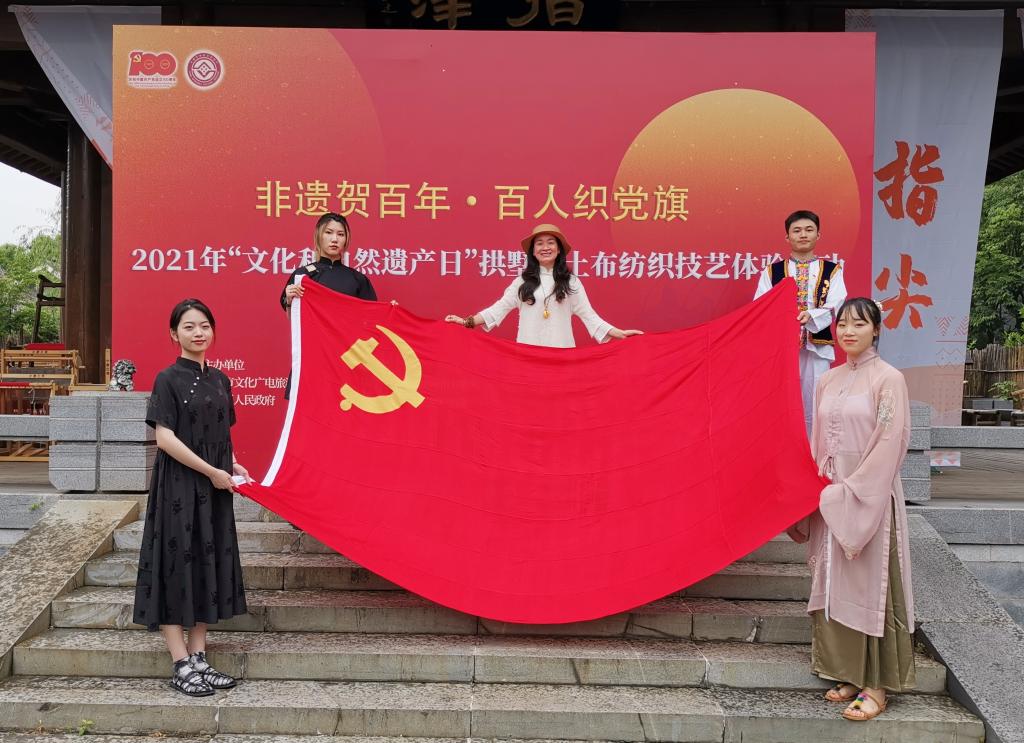本次活动是由杭州市文化广电旅游局、拱墅区人民政府、杭州市非物质文化遗产保护中心等单位共同举办,56个民族的参与者通过使用省级非物质文化遗产—土布纺织技艺,亲手操作织布机,使用梭子织党旗,沉浸式体验非遗文化。期间,土布纺织技艺非遗传承人郑芬兰女士为师生们介绍文创产品“富甲一方”香囊,讲解该产品的设计背景及制作方式。让参与者在自己动手制作的同时,体会到传统工艺的独特魅力。