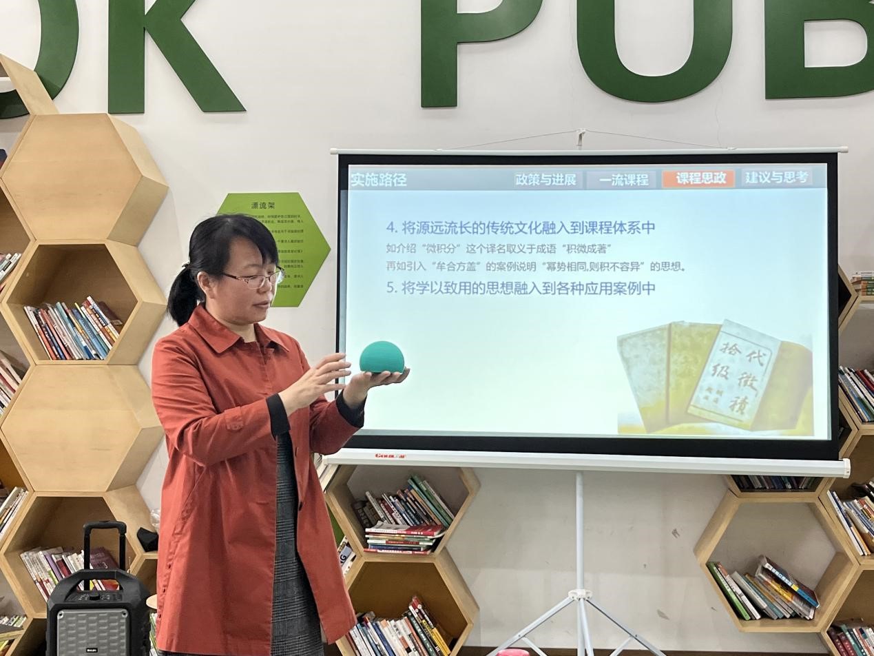 随后,高雪芬教授依次从“政策与进展”、“一流课程建设”、“课程思政建设”、“建议与思考”等几个环节展开讲座。高老师结合自己多次录制线上课程的经验,从课程录制环境、教具摆放和仪态表情等几个方面分享了遇到的问题及解决办法。谈到线上线下混合式课程时,她指出几个教学问题:学生互动不够、思想源流不明、概念结构不清、应用创新不足。在课程思政建设方面,高老师结合自己的专业课程提出将丰富的哲学思想融入到数学思想方法中;将科学精神、专业思想融入到数学知识中;将学生品格的培养融入到日常教学活动中;将源远流长的传统文化融入到课程体系中;将学以致用的思想融入到各种应用案例中。最后,高老师向大家展示了牟合方盖这一实际案例生动形象地体现了以学生为中心的教学理念,注重直观性、历史性、关系性,从而使学生更好地理解课堂。