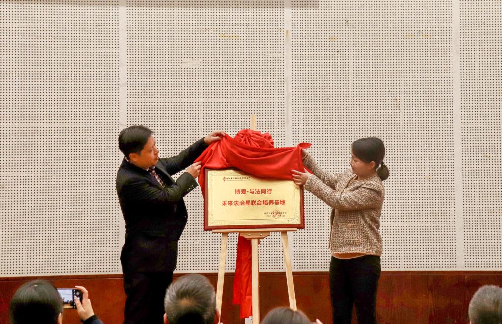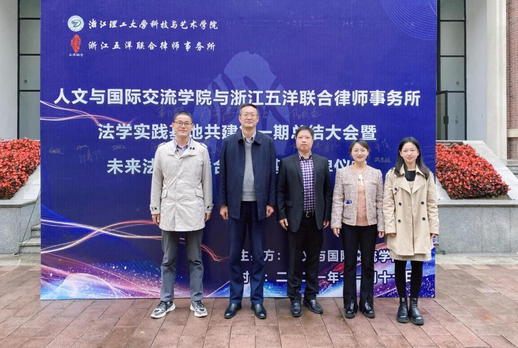 2021年11月17日下午,人文与国际交流学院同浙江五洋联合律师事务所法学实践基地共建的第一期总结大会暨“博爱·与法同行未来法治星联合培养基地”揭牌仪式在小报告厅隆重举行。浙江五洋联合律师事务所管理委员会主任陈松、国邦医药集团股份有限公司党委副书记孟仲建,科艺学院副院长阳盛益、综保部部长胡雪君,人文与国际交流学院院长盛赟、党总支书记贝金铸、党总支副书记郑春玲以及浙江五洋联合律师事务所的全体律师、人文与国际交流学院法学教师、辅导员及法学专业学生参加了本次活动。