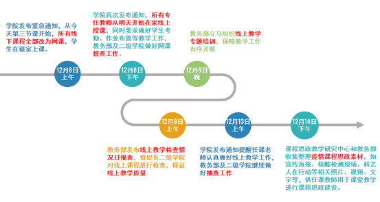 同时期,教务部门迅速反应,研究落实期末各项教学工作,及时调整课堂教学、实验实习、期末考试等安排。一系列相关教学通知的发布,及时保障了线上教学的平稳运行,最大限度降低疫情对教学工作的冲击和对学生学业的不利影响。