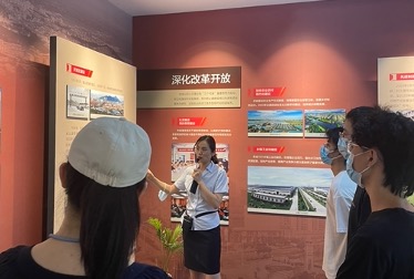 实践团成员在杭州湾上虞经开区发展成就展板前驻足,仔细深入的了解询问在这方土地上发生的故事。从解放战争时期的杭州湾北撤到历次大规模围涂造田,再到杭州湾上虞经济开发区的成立,同学们连连赞叹这片土地的沧桑巨变。