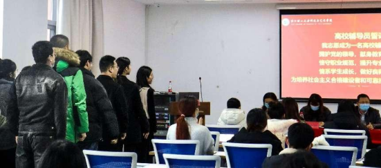 辅导员协会会长苏晓莉带领全体新入职导员庄严宣读高校辅导员誓词,共同发出承诺,表达了奉献教育事业的忠心和助力学生成长成才的决心,为学校教育事业发展和学生成长成才贡献智慧与力量。