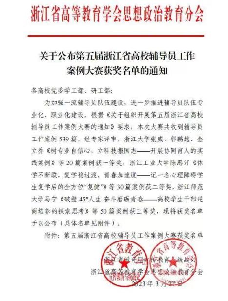 浙江省高校辅导员工作案例大赛由浙江省教育厅、浙江省高等教育学会思想政治教育研究分会组织开展,旨在深入学习贯彻党的二十大精神,进一步推进辅导员队伍专业化、职业化,加强一流辅导员队伍建设。第五届浙江省高校辅导工作案例大赛共收到全省高校推荐优秀作品539篇,评出三等奖以上100篇。我院汪静老师在与本专科高校辅导员的角逐中脱颖而出,以优秀的工作案例喜获佳绩,这是我院首次单独参赛,实现了我院辅导员工作省级荣誉新突破。