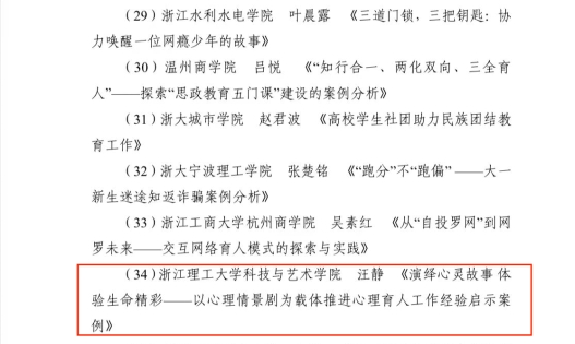 近日,第五届浙江省高校辅导员工作案例大赛获奖名单揭晓,我院辅导员汪静老师的作品《演绎心灵故事 体验生命精彩——以心理情景剧为载体推进心理育人工作经验启示案例》在大赛中经层层选拔,喜获三等奖。