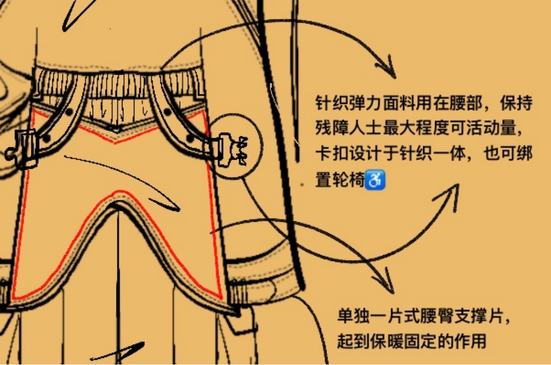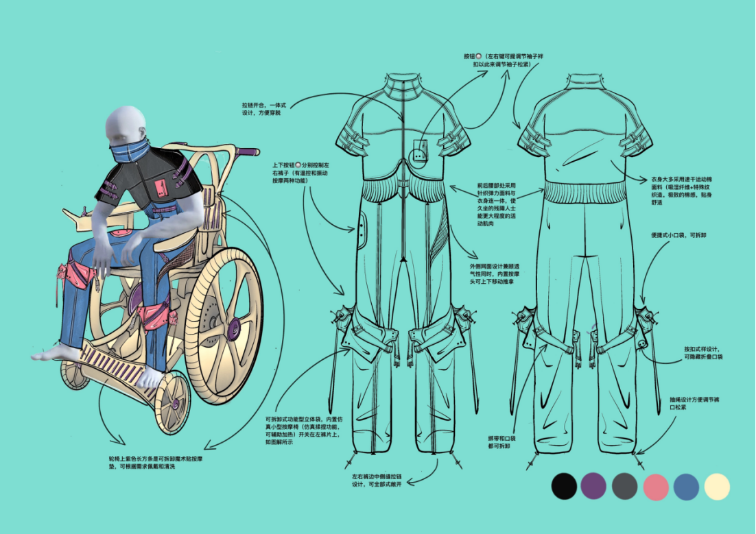 针对穿脱困难、依赖他人等痛点,团队提出三大创新设计:磁性前开襟系统替代传统纽扣,单手即可闭合;弹性立体腰围与低裆结构,适配坐姿体态,提升舒适度;模块化袖口与裤脚,支持自由拆卸,满足四季与场景变化需求。