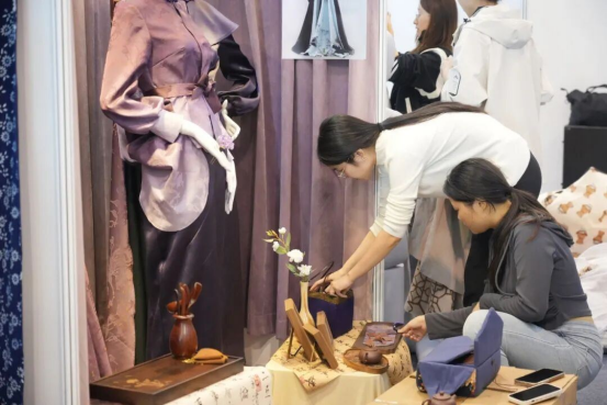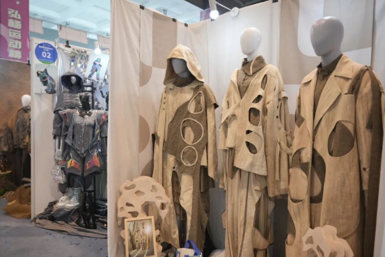 温州大学学生朱婉昕在现场分享了自己的设计理念,她表示,作品创作聚焦“大自然生长瞬间的美感”,通过金属液态化的动感设计,将自然生命力以时尚形态呈现,让静态的服饰拥有动态的视觉张力。嘉兴南湖学院学生夏镇冰带来的作品《牛仔营记》同样引人关注,这件长款牛仔服饰采用大量面料改造设计,不仅具备日常穿着的实用性,更以“可持续发展”为核心传递环保理念。“我的设计面向热爱环保的新青年群体,希望通过服饰设计,让环保理念更贴近生活,让更多人关注可持续时尚。”夏镇冰说道。