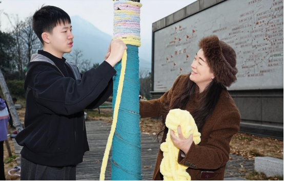 学生们充分发挥专业优势,紧扣冬至“暖冬” 主题,践行 “千编万化,万物皆可织” 的创作理念,巧用村民私藏毛线、枯枝等在地材料,围绕园区树木开展 “抱抱树” 装饰创作,为冬日树木披上 “暖心冬衣”。在这里,非遗编织技艺的传承不只是被 “展示”,而是真正融入生活、焕发生机。