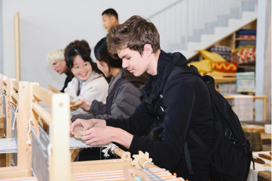 在“共织乡野 —— 余杭西部五镇在地材料编织创意赛” 现场,浙理工科艺师生与浙大城市学院国际学生、浙江交通职业技术学院学子同台创作,国际学生认真聆听中国学子讲解传统编织技巧、冬至吉祥纹样寓意及非遗美学元素,中外创意、校际灵感碰撞出别样火花。