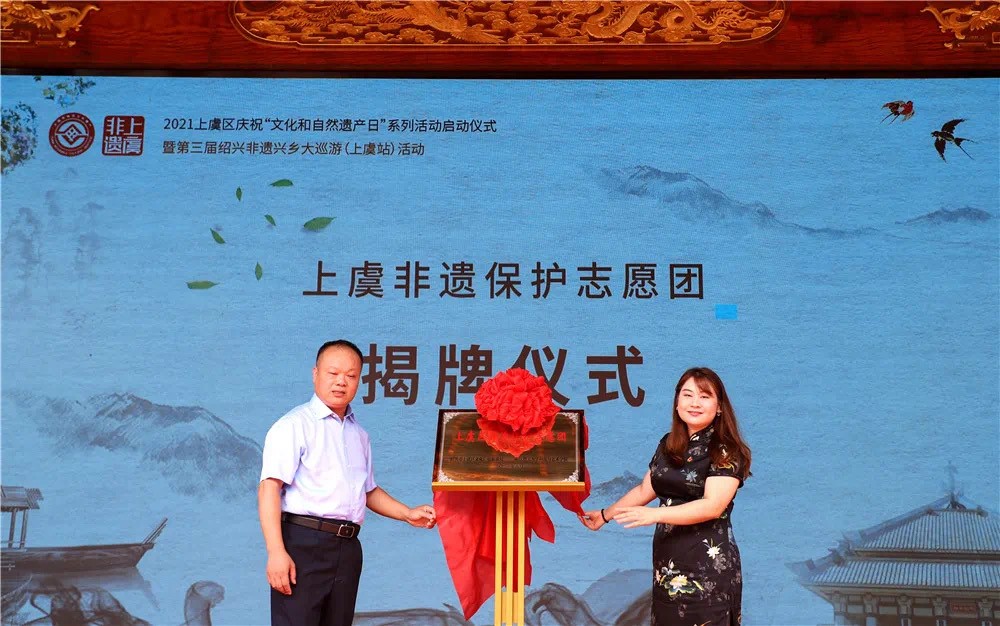 上虞非遗和旅游资源内容丰富,活力充沛,尤其是孝德文化历史底蕴深厚,影响深远。近年来,我院团委积极参与上虞孝德文化价值与内涵的探索,将“传承上虞孝德文化”融入大学生思想道德实践,呼吁弘扬文化遗产的时代价值,壮大非遗保护队伍,弘扬“奉献、友爱、互助、进步”的志愿服务精神,深化拓展新时代文明实践中心建设。科艺学院团委与上虞区文广旅游局结合上虞非遗文化实情,共同研究并达成合作共识,成立“上虞非遗保护志愿团”。在活动现场,绍兴市文化广电旅游局党委委员、副局长葛建民与我院团委副书记董程霞共同为“上虞非遗保护志愿团”揭牌。
