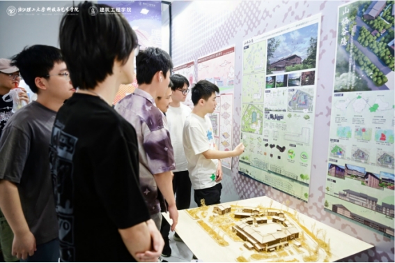 本次展览以“墨绘虞舜,遇建未来”为主题,共分为“传承”“融合”“蝶变”三个篇章,其中,传承篇作品来自2024届优秀毕业设计作品,这是匠心传承,勇于创新之结晶;融合篇作品展示了建工师生参与设计的小越街道未来产业社区改造项目、祝温村文旅综合体等项目以及以上虞乡村为设计对象而取得的省赛金奖作品,展现了我院与多个乡镇街道的深度融合联动;蝶变篇作品为历届优秀校友作品,彰显了我院校友走出校园后在祖国各地城市建设中的使命与责任。本次建筑设计展预计持续至6月底,后续将开展校外巡展,让优秀设计作品走出校园,促进地方建筑业和教育业的持续互动。