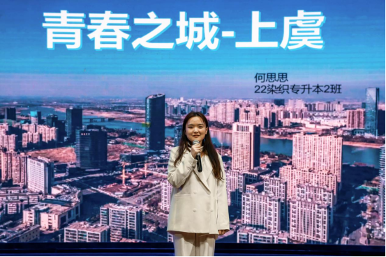 建筑工程学院覃琦同学,从身边上虞籍老师的故事讲起,体现上虞青年回归初心与上虞共成长的故事;人文与国际交流学院匡宇豪同学,通过上虞孝道文化,传递出青年人应有的精神内核,体现上虞新青年的精神;纺织服装学院何思思以催人奋进永不言败的精神传递青年人对上虞精神的理解;艺术与设计学院黄婧莹同学,用模范教育讲述新时代青年人的奉献力量,展示了未来上虞青春之城建设之美学文化;信息与控制学院邱梦圆同学巧用少年奇幻之旅为在场师生描绘出上虞学子对比现代与历史的体会;人文与国际交流学院潘橙通过“浙瓷”文化之美,讲述在上虞大地上与瓷器文化的相遇和传播传统文化的故事。