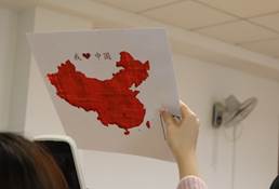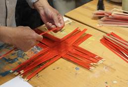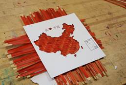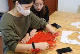 体验课中,张老师展示的一件件精美的竹编作品燃起了学生对竹编的兴趣。张老师首先向同学们介绍了竹编的历史和制作技艺。其后,张老师演示了“挑二压二”、“压一挑二” 的平面竹编技巧,展现了传统技艺。在他的悉心指导下,纤细的篾条在指尖上下翻飞、散乱的篾片渐渐形成了经纬纵横的花纹图案,竹编经过学生们的巧手制作成创意的红色主题作品,竹编创意的党徽寓意共产党人的高风亮节,竹编创意的中国红地图寓意对伟大的祖国无限的热爱。