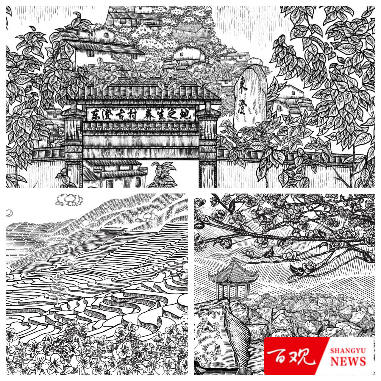 插画设计简介:设计团队采用木刻版画风格对“越州三绝”进行了图形化提取,希望运用木刻版画风格彰显“越州三绝”的历史底蕴与民俗文化。