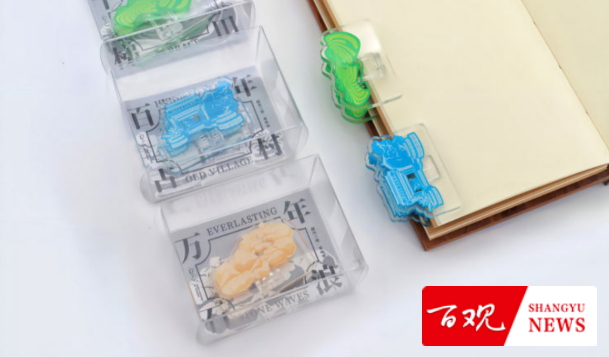 亚克力夹子设计简介:设计团队以几何图形概括的越州三绝为基础图形,以透明亚克力为载体,应用于纸质、书籍之上。