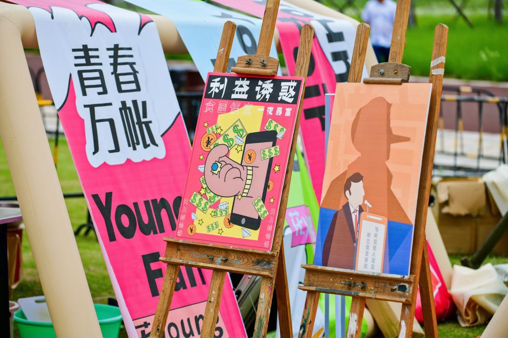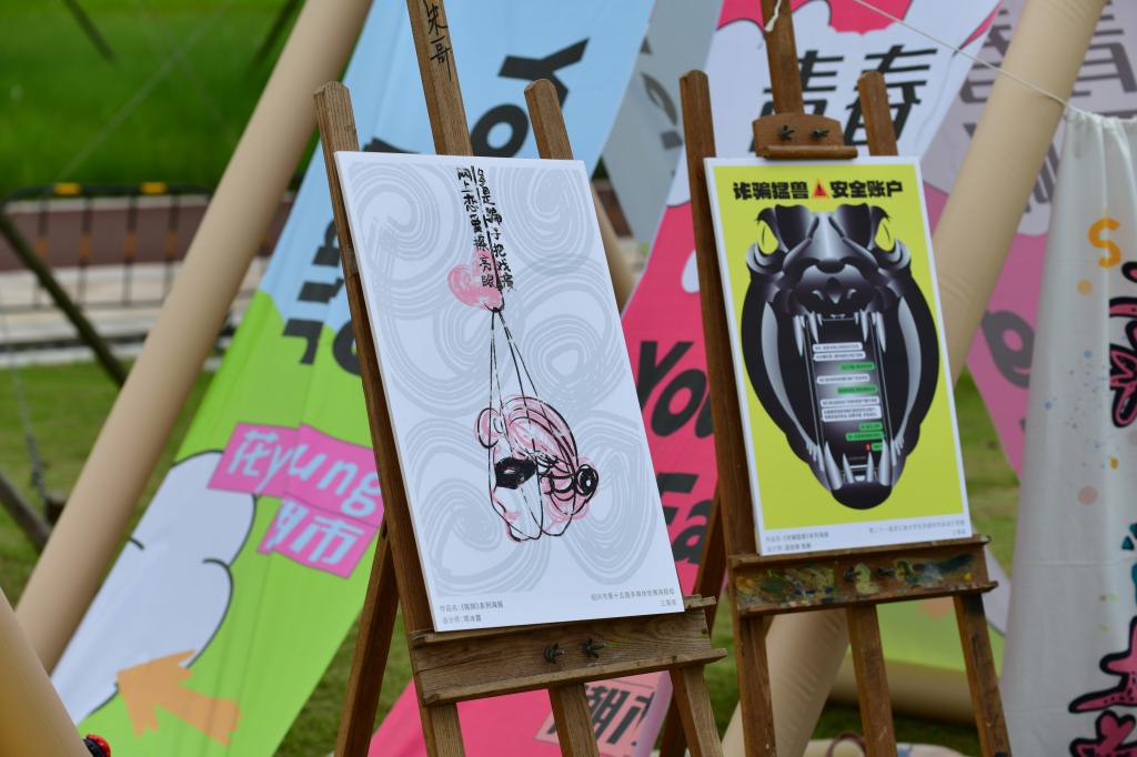 “艺”Young作品展:为进一步提醒居民以诚为本,以信立人,提高安全意识,浙江理工大学科技与艺术学院学生发挥专业特色,创作并展出了防诈骗主题宣传作品共50余份。作品通过图形创意,色彩设计,生动形象的揭示了常见诈骗手段,展示了预防警惕诈骗常识。